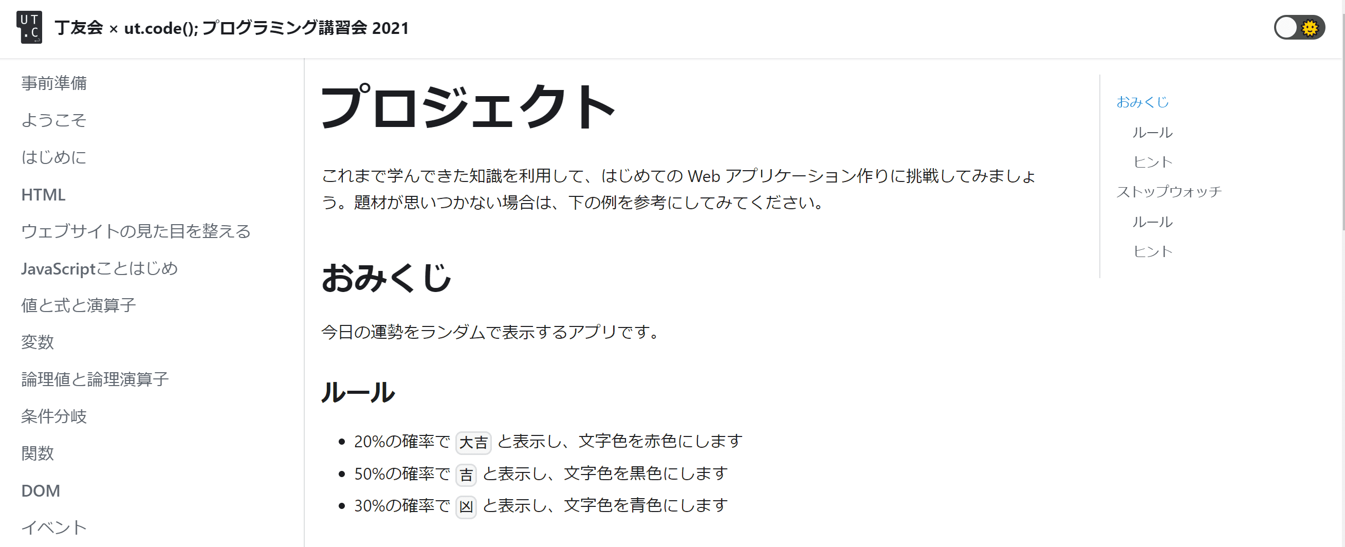 ut.code(); は、2021 年 10 月 16 日 (土)に、東京大学工学部丁友会と合同でプログラミング教室を開催しました。東京大学の学部生・大学院生を対象に、HTML と若干の CSS、JavaScript の基礎を学んでいただいた上で、シンプルなウェブアプリケーションをつくってもらうことを目標に設定しました。